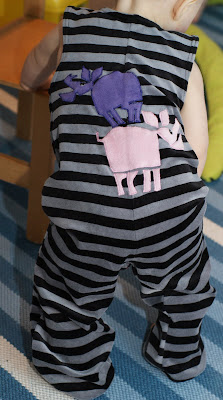 Kirppusen hasssut haalarit. Tai epäonnen haalarit. Kaikki meni vähän pieleen taas näissä. Kangas ei tahtonut riittää, vaikka olin mittaavinani että riittää. Etu- ja takakappaleen kankaat ovat eriperin, joten niissä on pieni väriero. Raitoja oli tosi veemäinen kohdistella, eikä ne osuneet kaikki ihan kohdilleen. (Oli muuten viimeinen kerta kun teen mitään enää raidallisesta kankaasta...) Noin pienten kuvien yksityiskohtien aplikointi oli ihan syvältä. Näyttävätkin juuri sille, ettei jaksanut keskittyä. Mutta eipähän ainakaan tullut liian pienet. Olevinani teen aina kasvuvaraa, mutta sitten ovat juuri sopivat, eli melkein pienet. Nyt mahtuvat ehkä hetken...